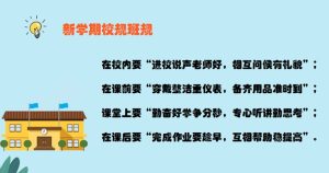没有规矩,不成方圆。新的学期,同学们要遵守学校的各项规章制度,争做品学兼优的学生。在校内要“进校说声老师好,相互问候有礼貌”;在课前要“穿戴整洁重仪表,备齐用品准时到”;课堂上要“勤奋好学争分秒,专心听讲勤思考”;在课后要“完成作业要趁早,互相帮助稳提高”。