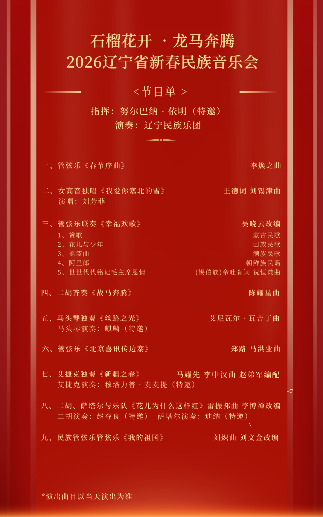 “龙”象征着中华文明的深厚底蕴与腾飞气魄,“马”呼应农历马年的生机活力,二者交融,寄寓着昂扬奋进的时代精神;而“石榴花开”则生动诠释了五十六个民族像石榴籽一样紧紧相拥,在新时代并肩前行、共迎佳节的和美景象。整场演出将沉浸于庄重而欢腾的节日氛围中,以民族音乐的语言,奏响团圆、奋进与希望的春节序曲。